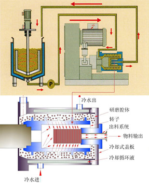 縮短漿料在磨腔內(nèi)的滯留時(shí)間,有效抑制溫度上升。通過(guò)循環(huán)冷卻水的冷卻,可實(shí)現(xiàn)低溫研磨。